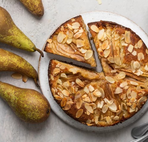Farine, poudre d’amandes, oeufs, sucre roux, lait, beurre, levure, poires