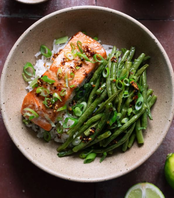 Saumon, beurre, huile d’olive, haricots verts, quinoa, sel, poivre, citron