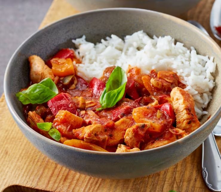 Poulet, riz, lait de coco, oignons, concentré de tomates, pulpe de tomates, yaourt, citron vert, épices (cumin, curcuma, gingembre, garam massala), ail, sel, poivre