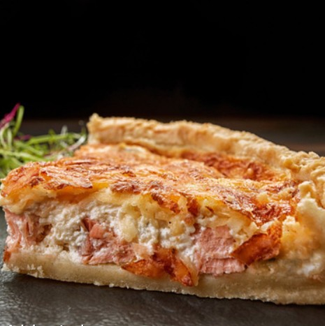 Pâte brisée (farine, beurre, oeuf, sel), oeufs, crème, lait, emmenthal, saumon fumé, sel, poivre
