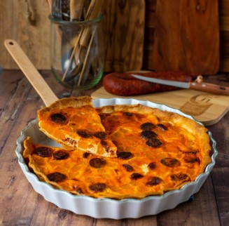 Pâte brisée (farine, beurre, oeuf, eau, sel), oeufs, crème, lait, patate douce, chorizo, sel, poivre