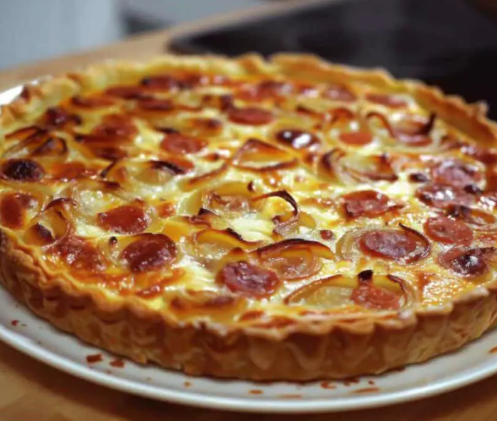 Pâte brisée (farine, beurre, oeuf, sel), oeufs, crème, lait, oignons, chorizo, emmenthal, sel, poivre